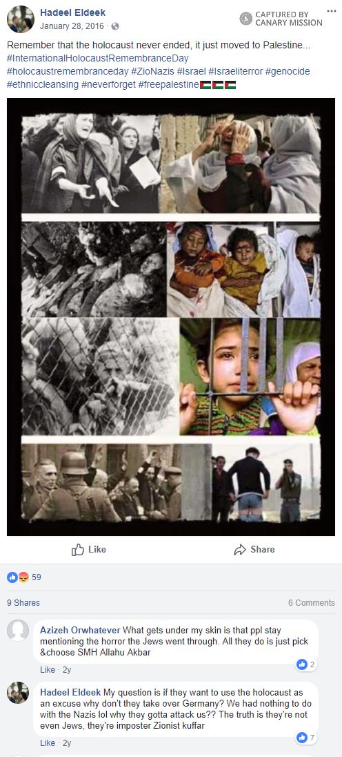 On January 28, 2016, Eldeek posted to Facebook “Remember that the holocaust never ended, it just moved to Palestine… #InternationalHolocaustRemembranceDay #holocaustremembranceday #ZioNazis #Israel #Israeliterror #genocide#ethniccleansing #neverforget #freepalestine