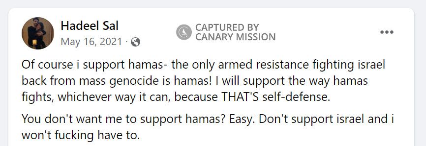 On May 22, 2021, Salameh posted to Facebook: “...Hamas is not a terrorist group, it is a liberation group, created as a result of the Israeli occupation to defend Palestinians from mass genocide and ethnic cleansing. Don't let the discourse change from Israel is the bad guy to Hamas is the bad guy- Hamas is not the problem here…”On May 16, 2021, Salameh posted to Facebook: “Of course i support hamas- the only armed resistance fighting israel back from mass genocide is hamas! I will support the way hamas fights, whichever way it can, because THAT'S self-defense…”