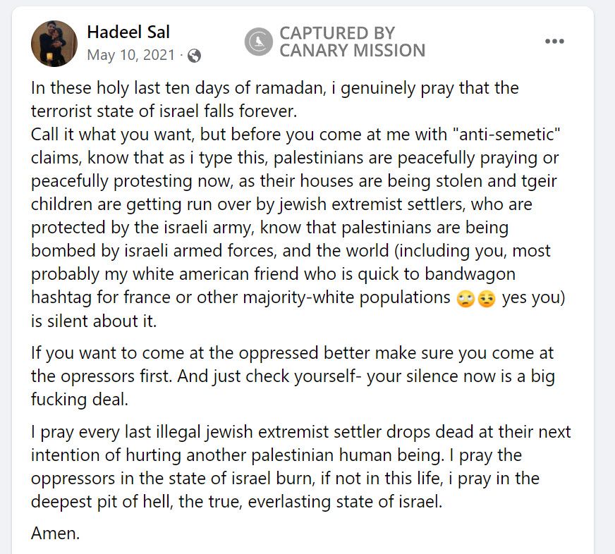On May 10, 2021, Salameh posted to Facebook: “In these holy last ten days of ramadan, i genuinely pray that the terrorist state of israel falls forever…I pray the oppressors in the state of israel burn, if not in this life, i pray in the deepest pit of hell, the true, everlasting state of israel. Amen.”Spreading Anti-Semitism