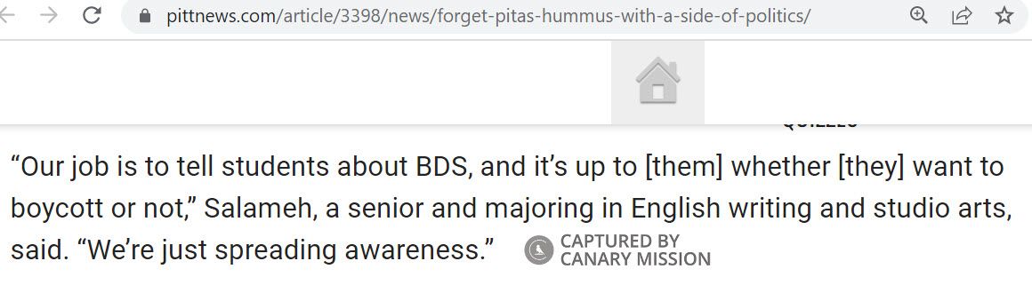 On November 24, 2014, Salameh was quoted in an article published in Pitt News as saying: “Our job is to tell students about BDS...”