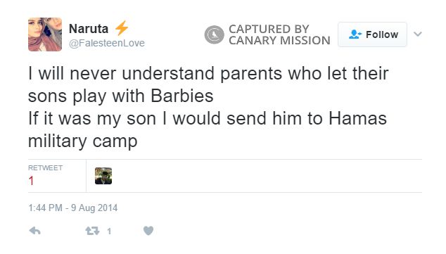 On June 12, 2013, Eid tweeted: “What i would do if zionists were standing in front of me: http://tmblr.co/Z0Y0SwlqKTJD “ — linking to a photo of a woman aiming a submachine gun.