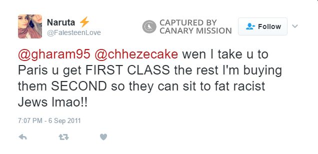 On September 6, 2011, Eid tweeted: “wen I take u to Paris u get FIRST CLASS the rest I'm buying them SECOND so they can sit to fat racist Jews lmao!!”