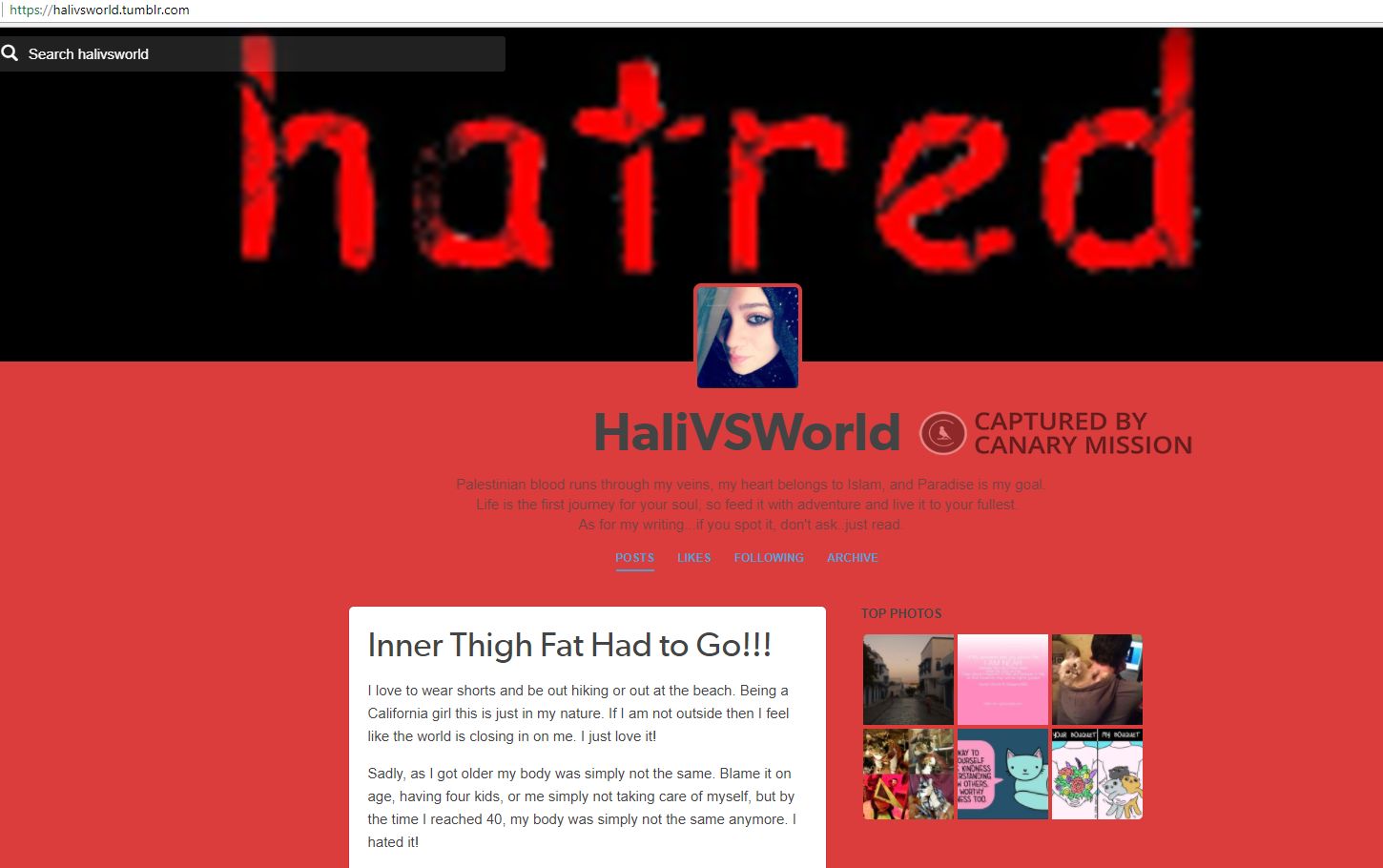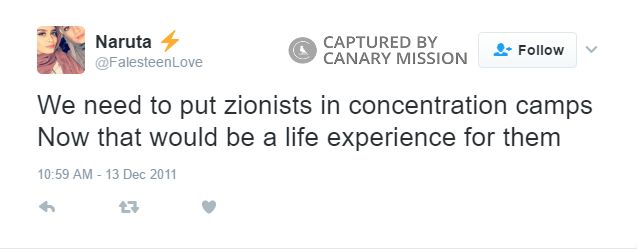 Halima Eid [Halima Saeed] has expressed a desire to murder Zionists, advocated violence,glorified the terror group Hamas, proposed putting Zionists in concentration camps and applauded Hitler.She has also spread hatred of Jews, Zionists and Israel. Eid has also compared Israel to Nazis and ISIS, spread anti-Israel conspiracies and made homophobic comments.