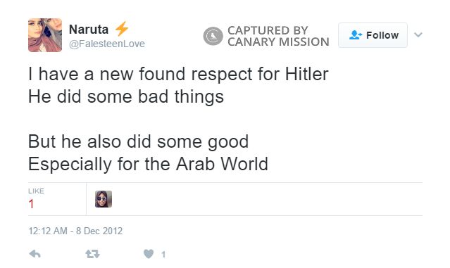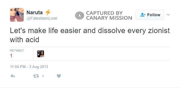 On June 19, 2013, Eid tweeted: “I hope you all have sweet dreams of slaughtering Zionists <3.”