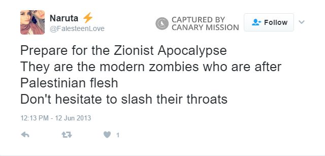 On June 12, 2013, Eid tweeted: “Prepare for the Zionist Apocalypse They are the modern zombies who are after Palestinian flesh Don't hesitate to slash their throats.”