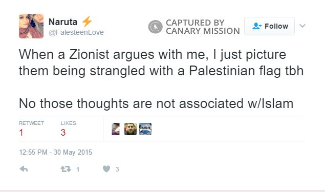 On June 18, 2013, Eid tweeted: “I hope you all have sweet dreams of slaying Zionists ^_^.”