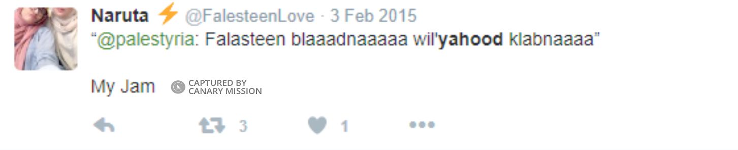 ’ blame the Jews’ Already blamed the Yahood [Jews].”On February 3, 2015, Eid tweeted: “ ‘@palestyria: Falasteen blaaadnaaaaa wil’yahood klabnaaaa [Palestine is our land and the jews are our dogs]’ My Jam.”