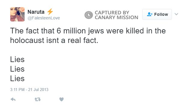On July 21, 2013, Eid tweeted: ‘The fact that 6 million jews were killed in the holocaust isnt a real fact. Lies Lies Lies.
