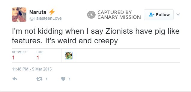 On March 5, 2015, Eid tweeted: “I'm not kidding when I say Zionists have pig like features. It's weird and creepy.”