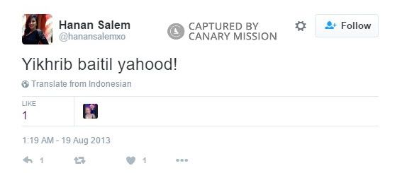 On August 19, 2013, Salem tweeted: “Yikhrib baitil yahood! [Destroy the homes of the Jews].”