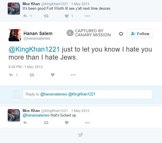 On May 1, 2013, Salem tweeted: “@KingKhan1221 just to let you know I hate you more than I hate Jews.”