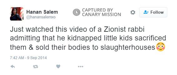 On September 9, 2014, Salem tweeted: “Just watched this video of a Zionist rabbi admitting that he kidnapped little kids sacrificed them & sold their bodies to slaughterhousesSalem’stweet referred to a Youtube audio of a piece of radio-theatre, titled: “BLOOD SACRIFICE FOR MCDONALD'S (DVD) feat Zionist Rabbi abe finkelstein & James Wickstromm” that featured a series of anti-Semitic blood libels.