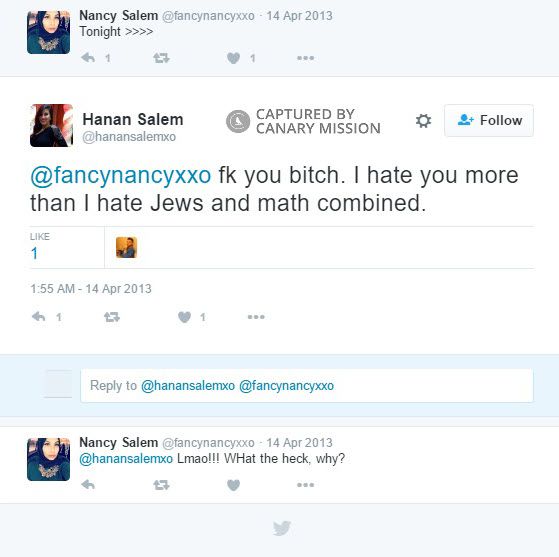 On April 14, 2013, Salem tweeted: “@fancynancyxxo fk you b**ch. I hate you more than I hate Jews and math combined.”