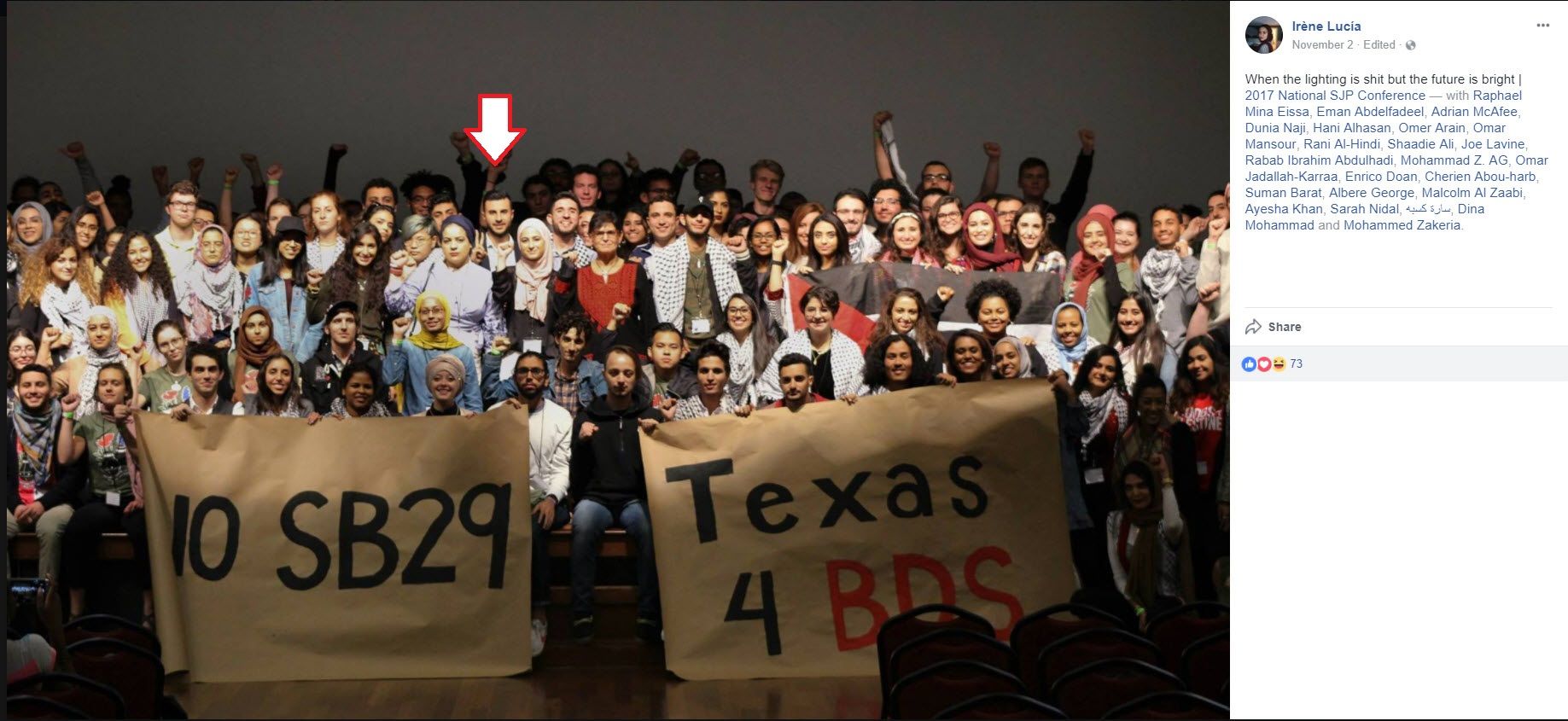 Hani Alhasan is an activist with Students for Justice in Palestine (SJP) at the University of Oklahoma (UO) and attended the 2017 National SJP (NSJP) Conference.NSJP 2017 was held October 27-29, 2017 at the University of Houston (UH). The conference was themed “A Reimagined World: Dismantling Walls from Palestine to the Rio Grande.” Per the 2017 National SJP Conference website, the conference aimed to strengthen “collaborative efforts within all regions to pass BDS” and envision “pathways to achieving sanctions in the future.”