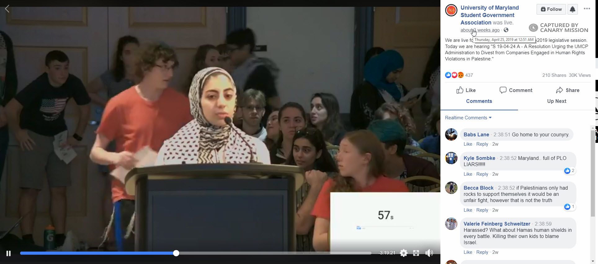 In the video, Shraim said [02:39:49]: “Palestinians live in an open-air prison and it is our duty as UMD students to fight for the rights of those people.”