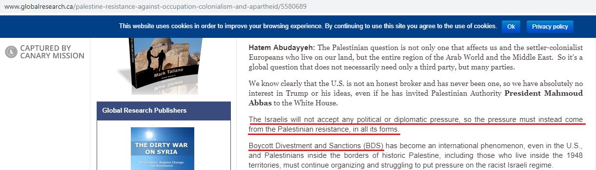 In a March 20, 2017 interview published in GlobalResearch, Abudayyeh praised Hamas for taking “the most leading role in the military resistance against Israel” and called Palestinian terror groups “resistance forces.” He also promoted BDS as a form of “resistance” against Israel.Abudayyeh said: “The Israelis will not accept any political or diplomatic pressure, so the pressure must instead come from the Palestinian resistance, in all its forms.”