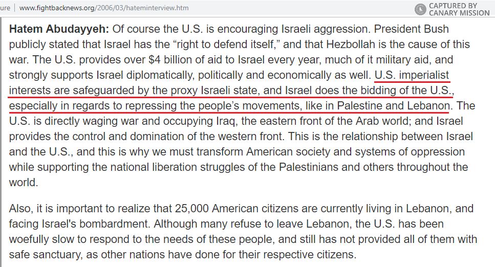 In a July 22, 2006 interview, Abudayyeh called for support for the terror groups Hezbollah and Hamas, saying: “The U.S. and Israel will continue to describe Hamas, Hezbollah and the other Palestinian and Lebanese resistance organizations as ‘terrorists,’ but the real terrorists are the governments and military forces of the U.S. and Israel … the Lebanese and Palestinian resistance must be supported.”