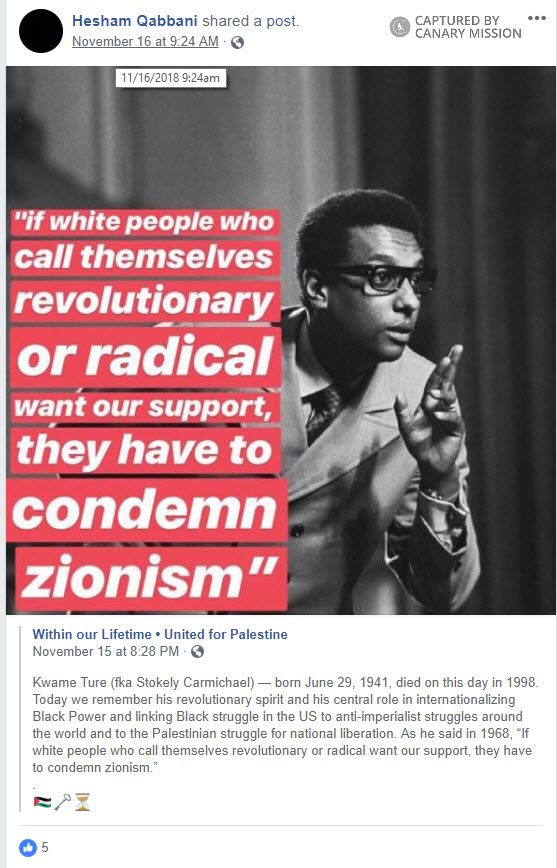 On November 18, 2018, the US Palestine Community Network (USPCN) posted on Facebook the 2018 National SJP keynote speech by Hatem Abudayyeh, USPCN’s co-founder.Abudayyeh has supported [00:08:45] convicted terrorists, praised terror organizations, called for Israel’s destruction and is an activist in theBoycott, Divestment, Sanctions (BDS) movement.