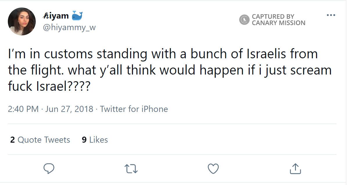 On June 27, 2018, Wazwaz also tweeted: “I’m in customs standing with a bunch of Israelis from the flight. what y’all think would happen if i just scream f**k Israel????”