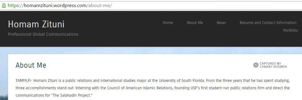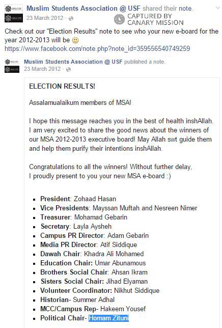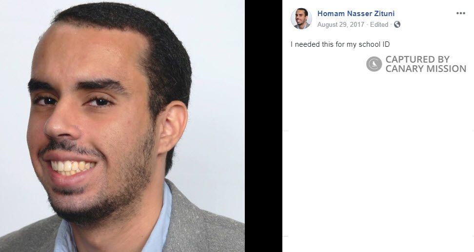 Homam Zituni [Homam Nasser Zituni] has praised a terrorist and promoted anti-Israel agitators. He was heavily involved in the Boycott, Divestment, and Sanctions (BDS) movement at the University of South Florida (USF), in 2014, as a member of Students for Justice in Palestine (SJP).Zituni was elected political chair for the Muslim Students Association (MSA) at USF in 2012-2013 and served as an intern for the Council of American-Islamic Relations (CAIR) in 2013.