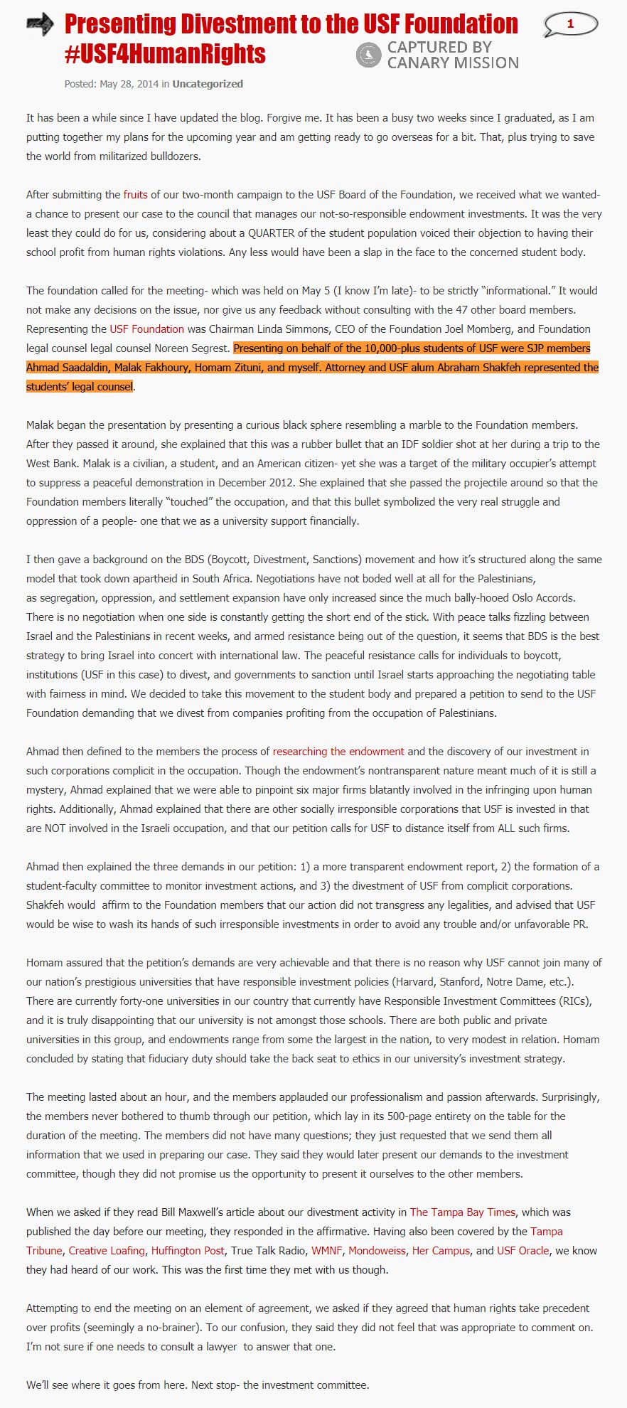 On May 5, 2014, Zituni presented SJP’s BDS petition to the CEO, Foundation Board Chair and legal counsel of USF alongside fellow SJP members Ahmad Saadaldin, Omar Erchid and Malak Fakhoury.