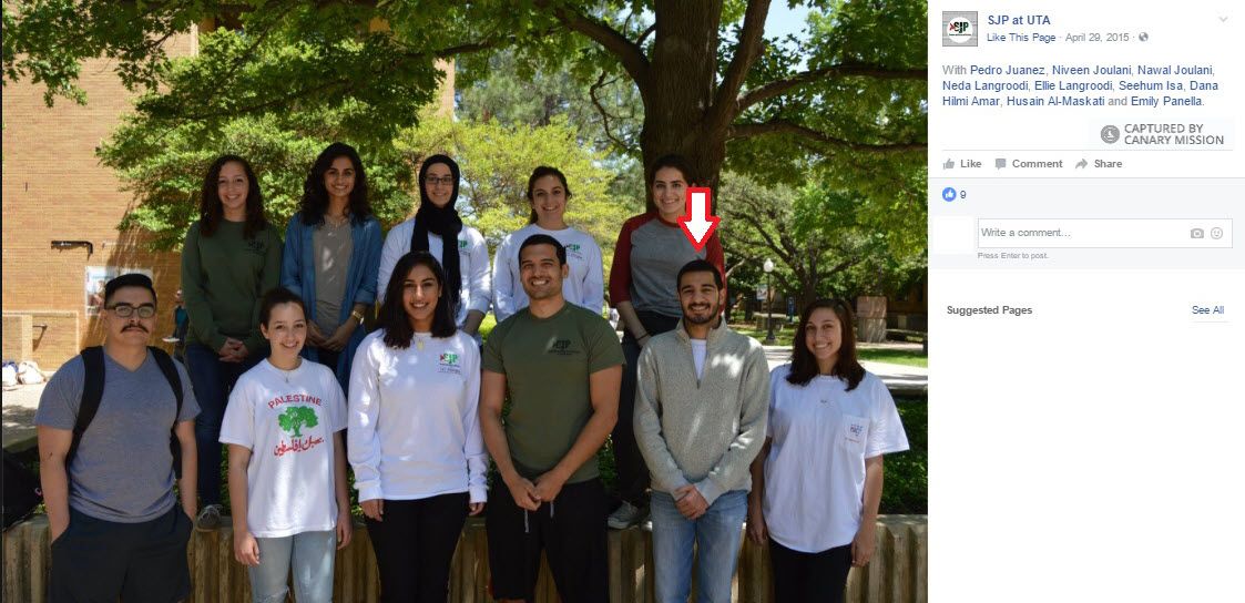 On November 25, 2014, SJP UT Arlington promoted an event on Facebook supporting Rasmea Odeh.