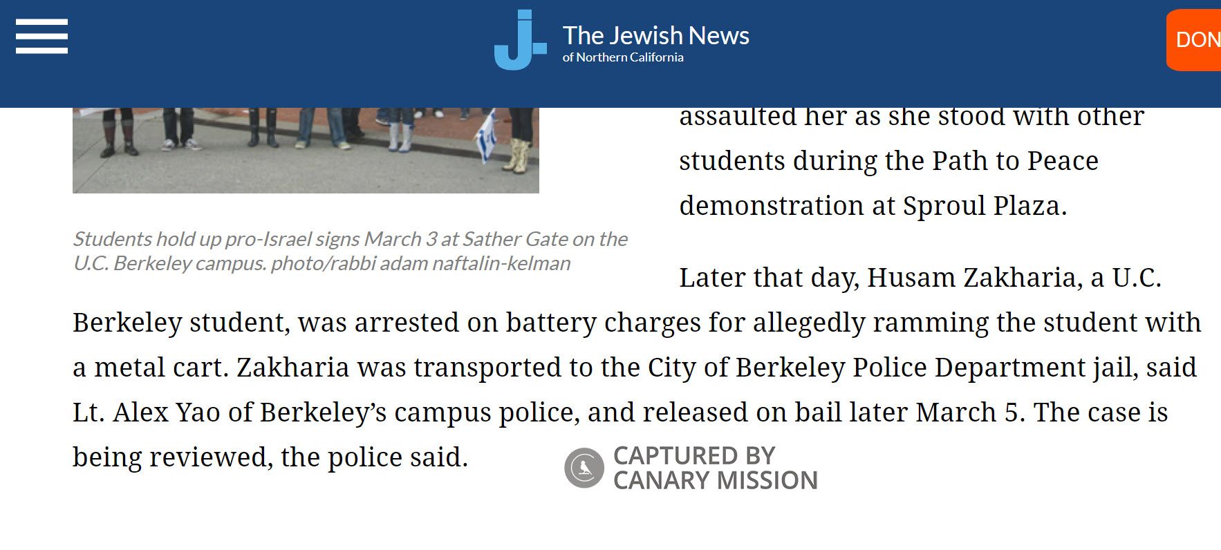 On March 5, 2010, Zakharia was reportedly arrested on battery charges for ramming a shopping cart into a female Jewish student who was holding up a sign that read: “Israel wants peace.”In 2011, Zakharia reportedly physically attacked two Jewish students during a disruption of a pro-Israel concert.