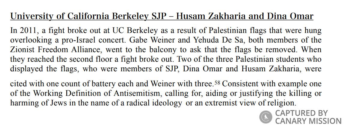 Husam Zakharia [Husam Samir Khalil Zakharia] has physically attacked Jewish students, spread hatred of Zionists and Zionism, demonized Israel and participated in anti-Israel activism.Zakharia reportedly served as the head of Students for Justice in Palestine (SJP) at The University of California, Berkeley (UC Berkeley) in 2010.