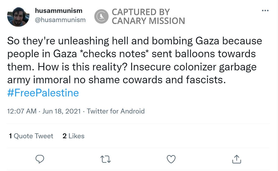 On June 18, 2021, Zakharia tweeted: “So they're [Israel] unleashing hell and bombing Gaza because people in Gaza…sent balloons towards them. How is this reality? Insecure colonizer garbage army immoral no shame cowards and fascists. #FreePalestine.”