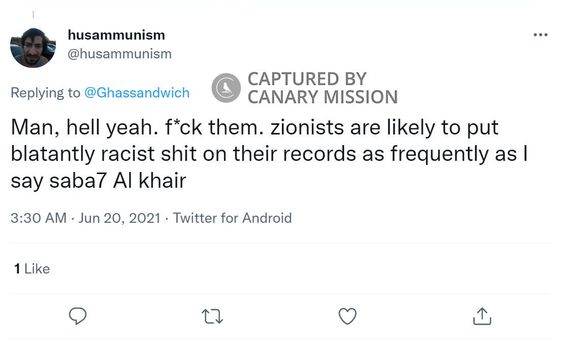 On June 20, 2021, Zakharia tweeted: “Man, hell yeah. f**k them. zionists are likely to put blatantly racist s**t on their records as frequently as I say saba7 Al khair [good morning].”On June 10, 2021, Zakharia tweeted: “Zionism is such a pathetic colonizer movement…”