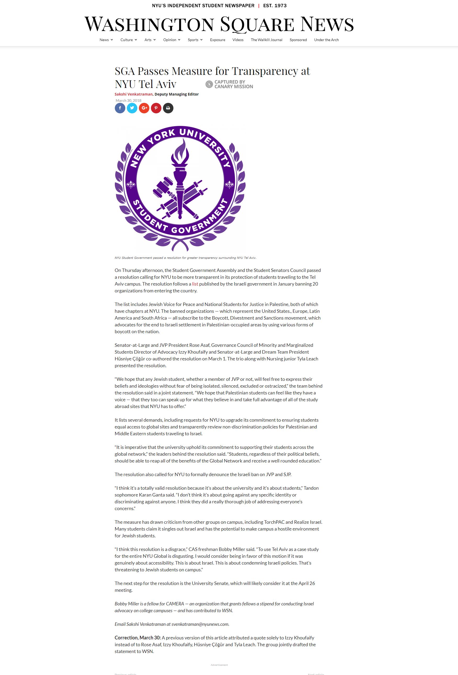 On March 1, 2018, Çöğür reportedly proposed a resolution to NYU’s Student Government Association (SGA), which was drafted by former student senator and SJP member Rose Asaf, that demonized Israel.