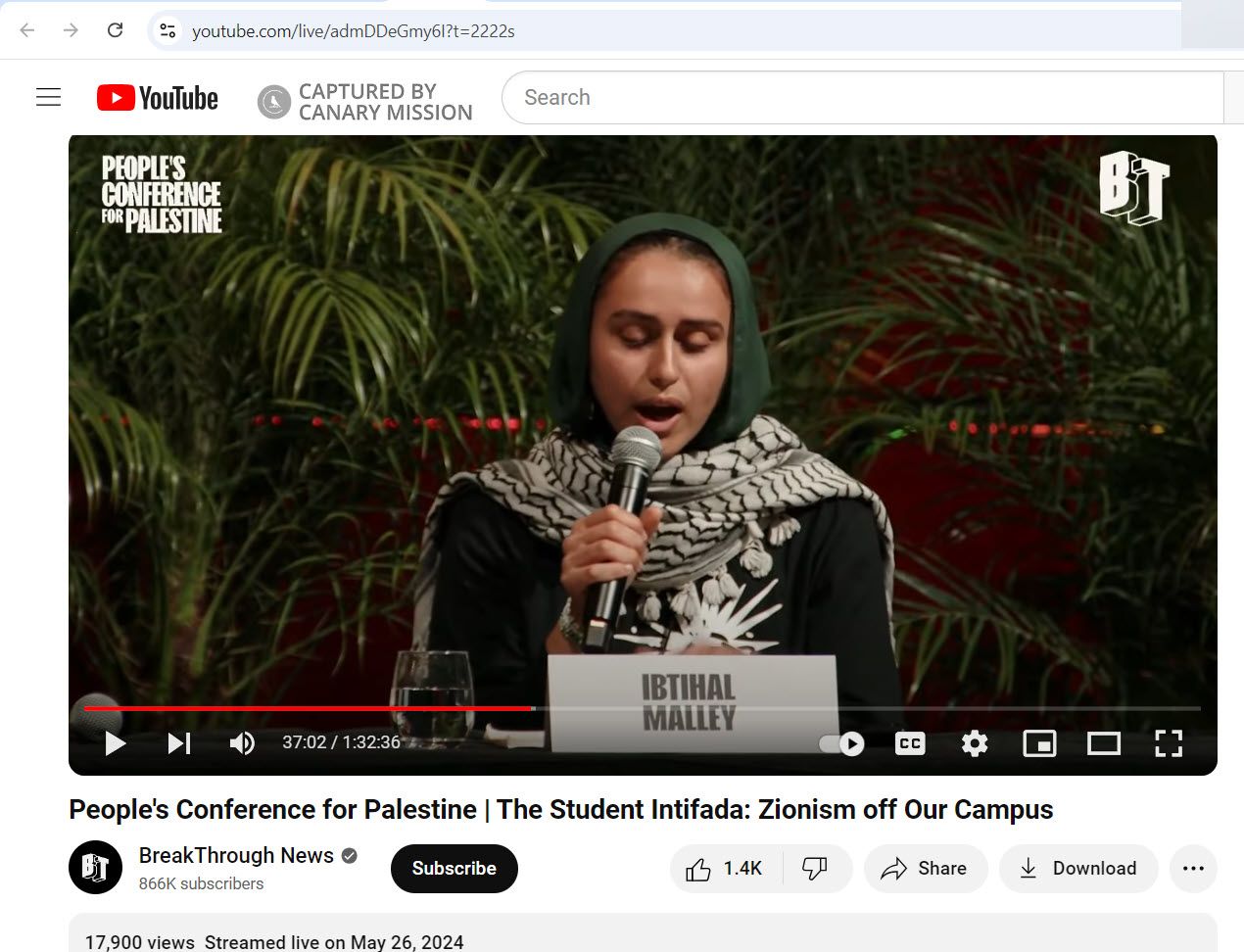 On May 26, 2024, BreakThrough News uploaded a video to YouTube featuring Malley speaking at the People’s Conference for Palestine in Detroit, Michigan. PYM co-organized the conference which was held during Israel’s war against Hamas terrorists, launched after Hamas murdered approximately 1,200 Israelis on October 7, 2023.In her speech, Malley said [00:37:02]: “We have a commitment to strengthening ourselves as organizers and strengthening our movement, especially right here in the belly of the beast. And I think it’s important that we push back against this narrative that our movement is fragmented and recognize that as the more unified we are, the stronger our movement is, and the bigger threat that we present to the U.S. empire and our complicit institutions.”