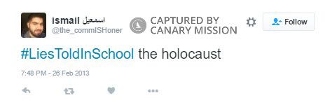 On February 26, 2013, Aboukar tweeted: “#LiesToldInSchool the holocaust.”