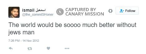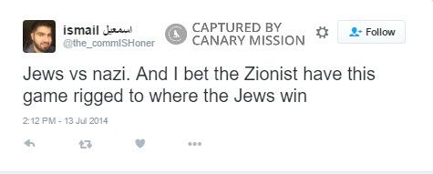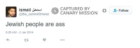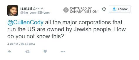 On July 26, 2014, Ismail Said Aboukar, an SJP and MSA UT Arlington activist, tweeted: “@CullenCody all the major corporations that run the US are owned by Jewish people. How do you not know this?”