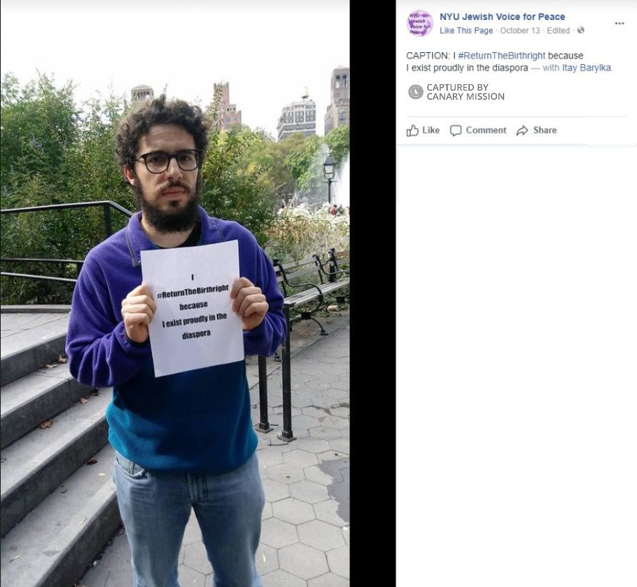 On October 12, 2017, Barylka was featured in a series of photos on NYU JVP’s Facebook page, promoting JVP’s #returnthebirthrightcampaign.Barylka held a sign that read: “I #ReturnTheBirthright because I exist proudly in the diaspora.”