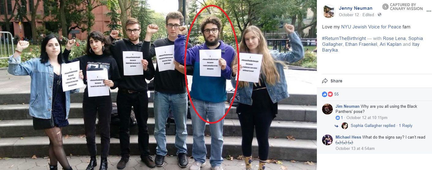 The series of NYU JVP Facebook photos were also shared on the Return the Birthright Facebook page. The caption of the photos read, in part: “We refuse to be complicit in a propaganda trip that whitewashes the systemic racism and daily violence faced by Palestinians living under endless occupation.”