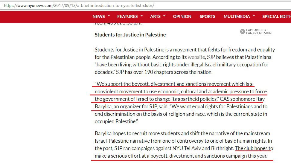 In a September 12, 2017 interview with the Washington Square News, Barylka was quoted saying that SJP at NYU “support[s] the boycott, divestment and sanctions movement which is a nonviolent movement to use economic, cultural and academic pressure to force the government of Israel to change its apartheid policies.”The article also said that Barylka hoped to recruit more students to join SJP, and that the group “hopes to make a serious effort at a boycott, divestment and sanctions campaign this year.”