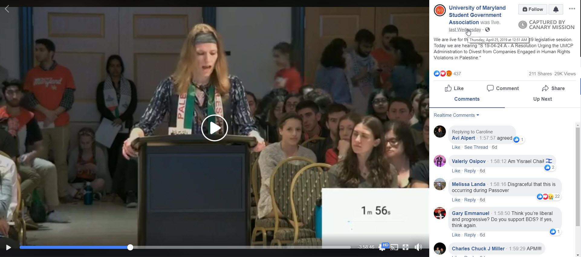 On April 24, 2019, Radcliffe was featured [01:59:28] in a video posted on Facebook by the UMD Student Government Association (SGA), urging the SGA to pass a BDS bill. The bill was launched by Divest UMD.Divest UMD is a campaign that calls on UMD to divest from companies that do business with Israel.