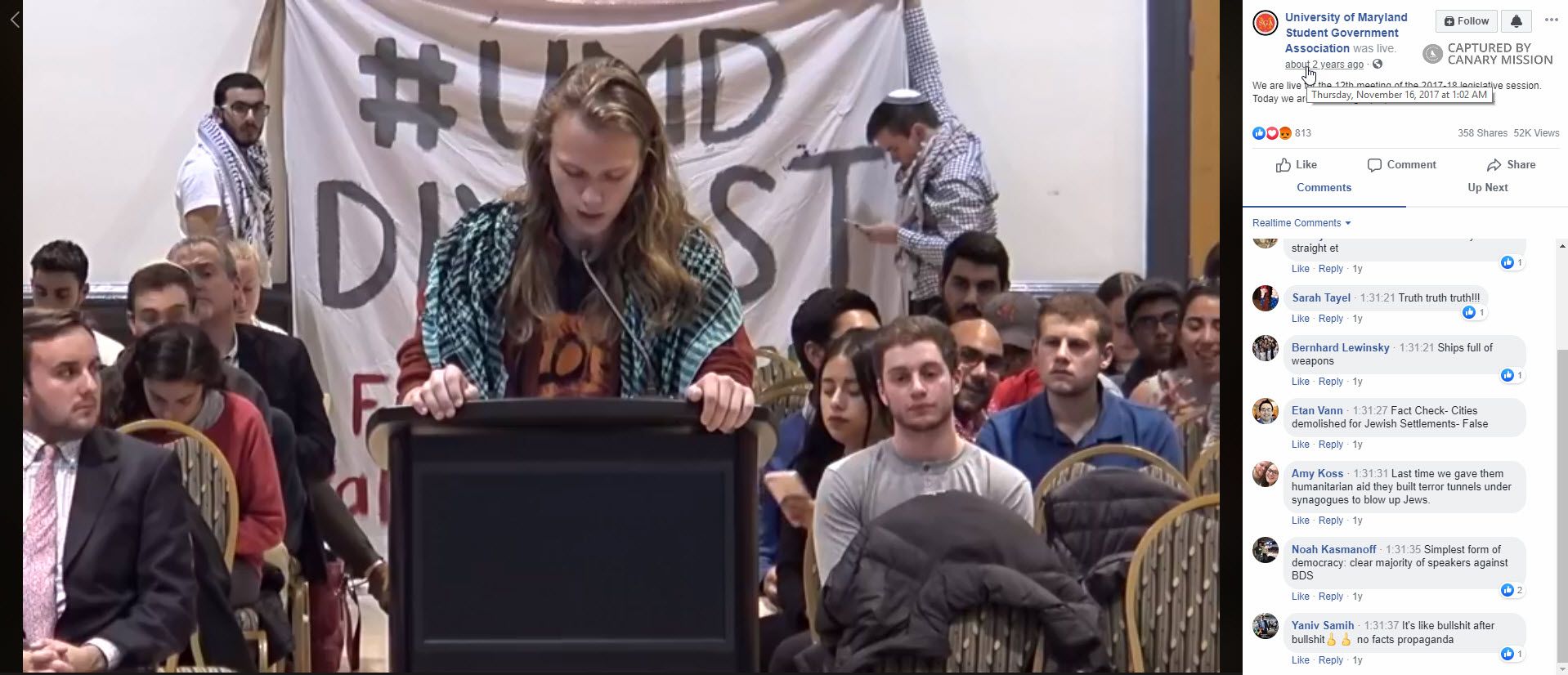 On November 17, 2017, Radcliffe was featured [01:29:47] in a video shared on Facebook by the UMD SGA, speaking in support of a divestment bill at an SGA meeting.
