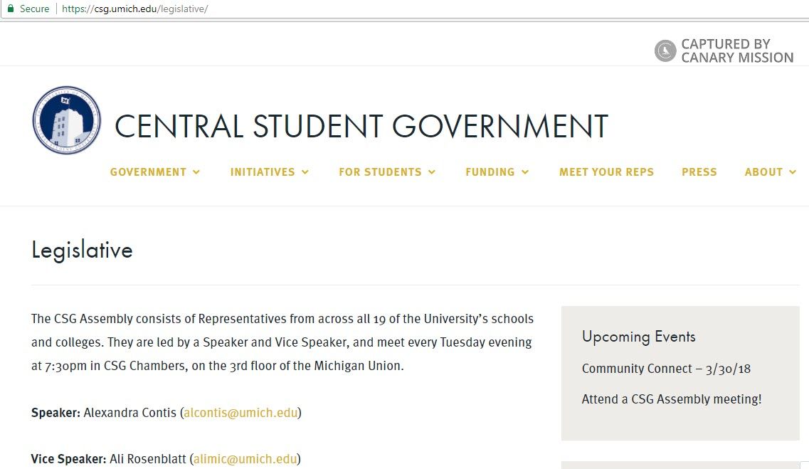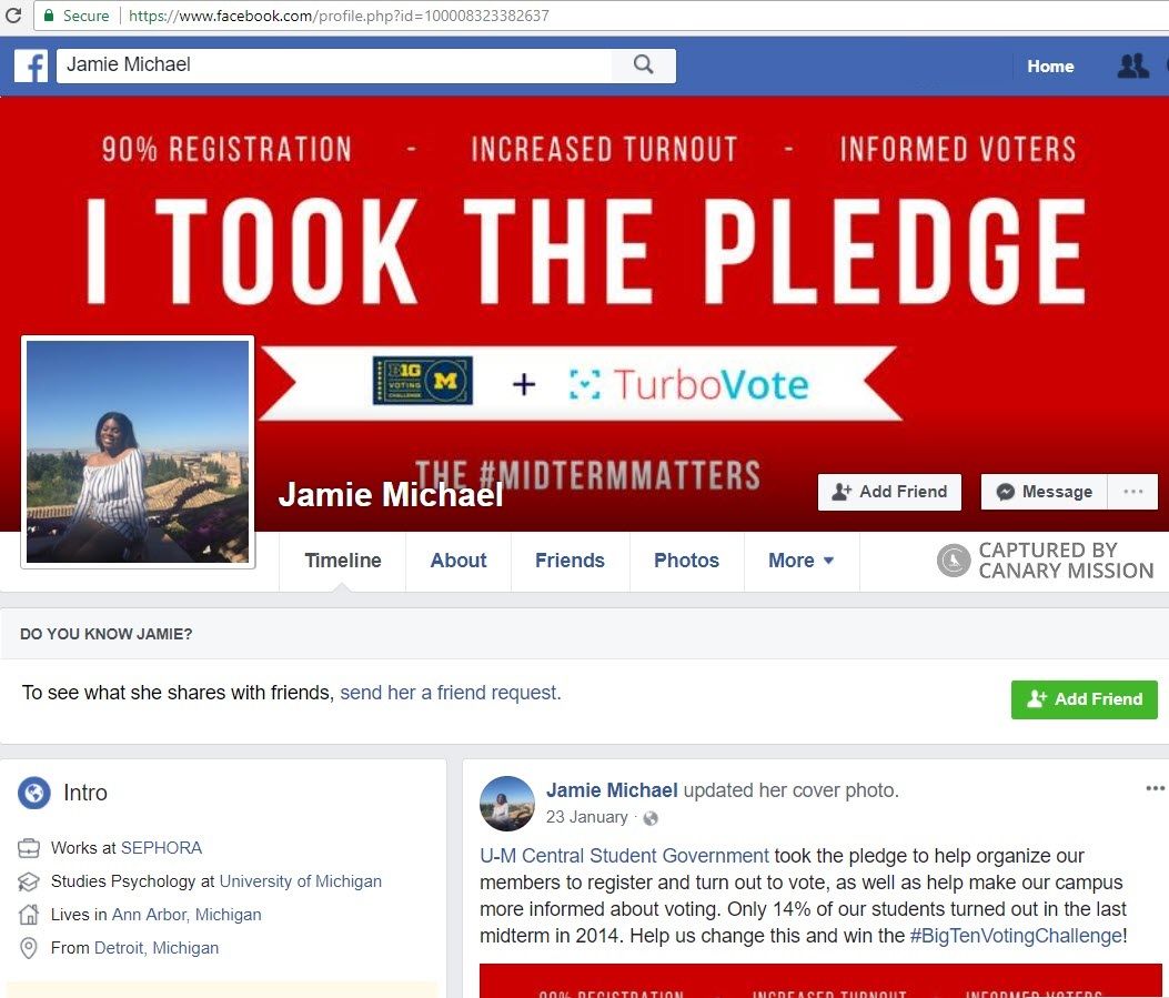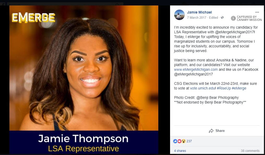 Jamie Thompson sponsored a Boycott, Divestment, Sanctions (BDS)resolution presented to the University of Michigan, Ann Arbor (UM Ann Arbor) Central Student Government (CSG) as a student representative in 2017.She also voted for the resolution to be held via a secret ballot.