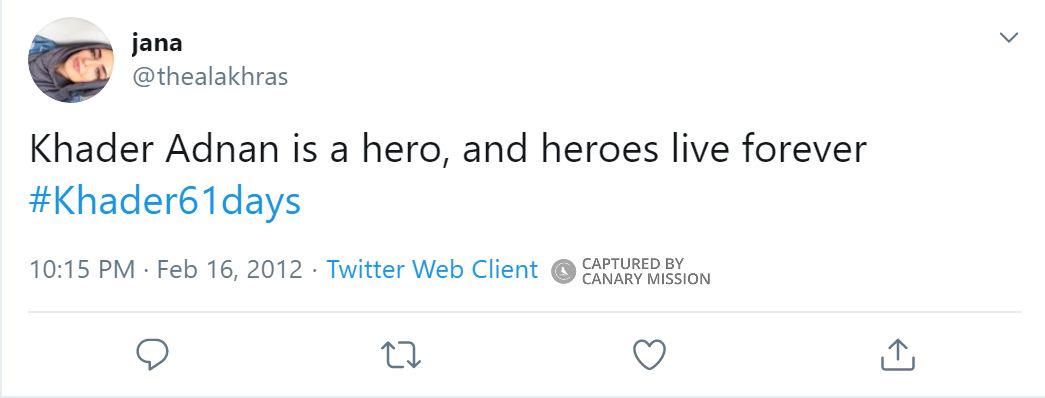 On February 16, 2012, Al-Akhras tweeted: “Khader Adnan is a hero, and heroes live forever #Khader61days.”