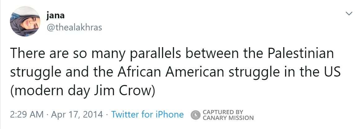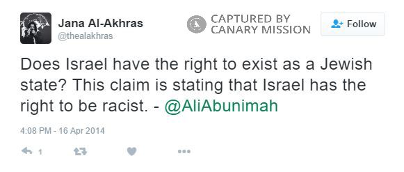 On April 16, 2014, Al-Akhras tweeted: “Does Israel have the right to exist as a Jewish state? This claim is stating that Israel has the right to be racist.” She attributed the statement to Ali Abunimah, co-founder of the anti-Israel website Electronic Intifada (EI).