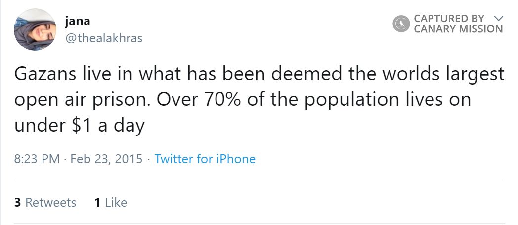 On July 7, 2015, Al-Akhras tweetedat Snapchat with a screenshot of a tweet that labeled the Israeli coastal city of Tel Aviv “a colony built upon the stolen Palestinian city of Yaffa” and claimed the beaches “double as mass graves.”On February 23, 2015, Al-Akhras tweeted: “Gazans live in what has been deemed the worlds largest open air prison. Over 70% of the population lives on under $1 a day.”