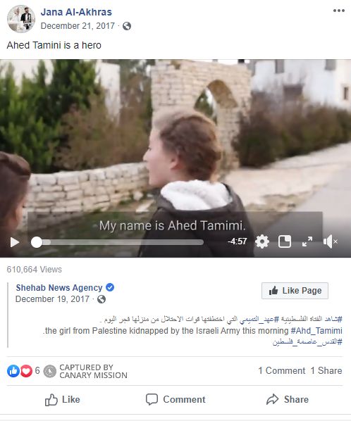On December 21, 2017, Al-Akhras posted to Facebook: “Ahed Tamini [sic] is a hero” and attached a video glorifying Ahed Tamimi.