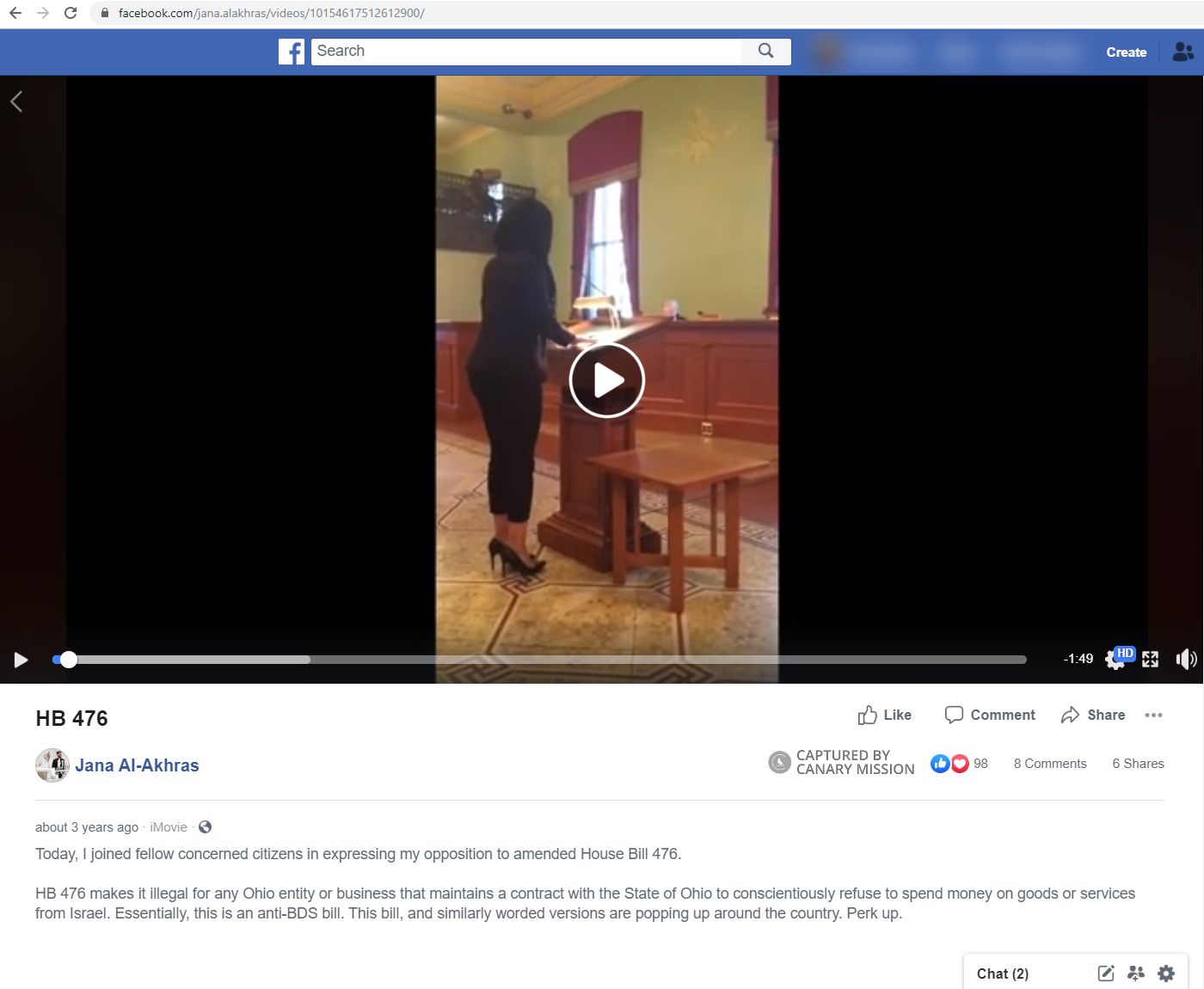 On December 7, 2016, Al-Akhras spoke against Ohio anti-BDS bill HB 476, claiming [00:00:20] it was “not for the benefit of constituents” and that [00:00:23] “this bill would put the allegiances towards a foreign nation ahead of the allegiances of your fellow statesmen.”