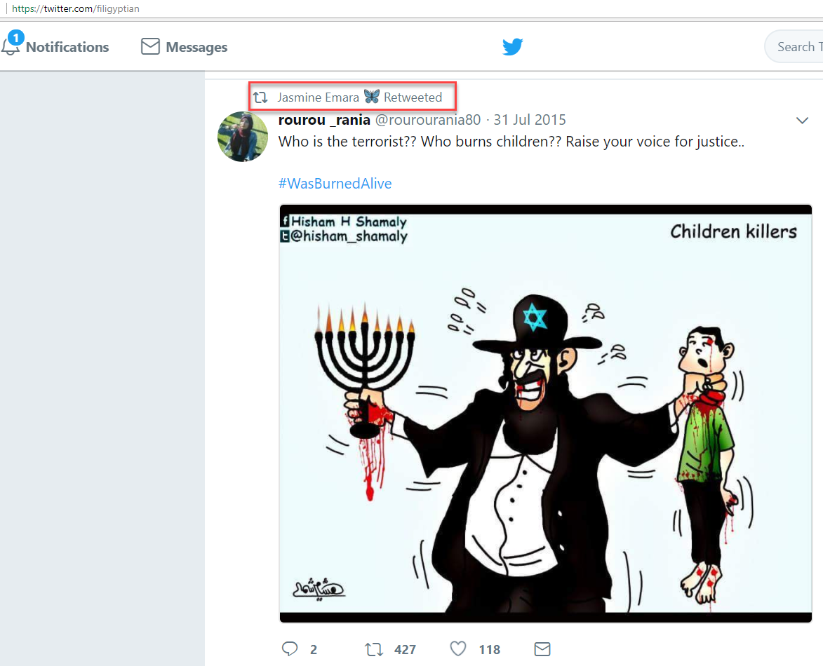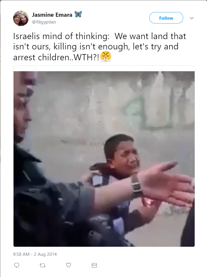 On August 2, 2014, Emara tweeted: “Israelis mind of thinking: We want land that isn't ours, killing isn't enough, let's try and arrest children..WTH?!