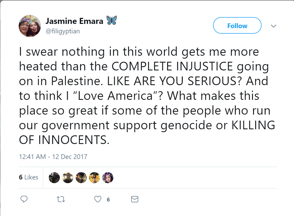 On July 4, 2015, Emara tweeted: “Can't a country be its own country? I mean I wouldn't support Israel if it was my home country, killing innocent?” Her tweet linked to another tweet that read: “Message is loud and clear #FreePalestine”