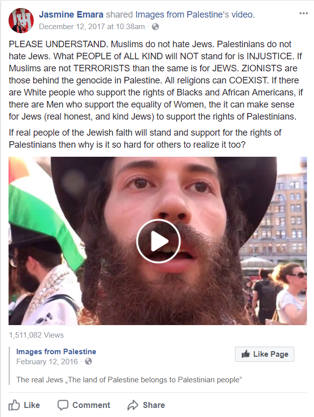 On December 12, 2017, Emara posted to Facebook a video of Neturei Karta members participating in an anti-Israel protest and wrote that “Jews (real honest, and kind Jews)” can “support the rights of Palestinians.” She also wrote “ZIONISTS are those behind the genocide in Palestine.”Neturei Karta is a fringe anti-Israel Jewish group whose leader, Rabbi Yisroel Dovid Weiss, was excommunicated from many Ultra-Orthodox Jewish groups for participating in a 2006 Holocaust denial conference.