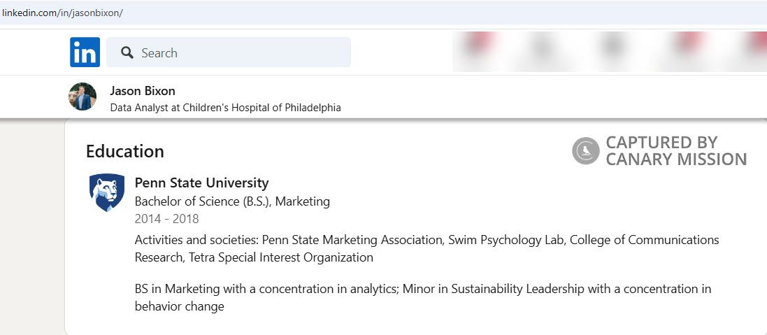 As of November 2024, Jason Bixon’s LinkedIn profile said he was a data analyst at the Children’s Hospital of Philadelphia in Philadelphia, Pennsylvania. He graduated from Pennsylvania State University (PSU) with a bachelor’s degree in marketing in 2018.