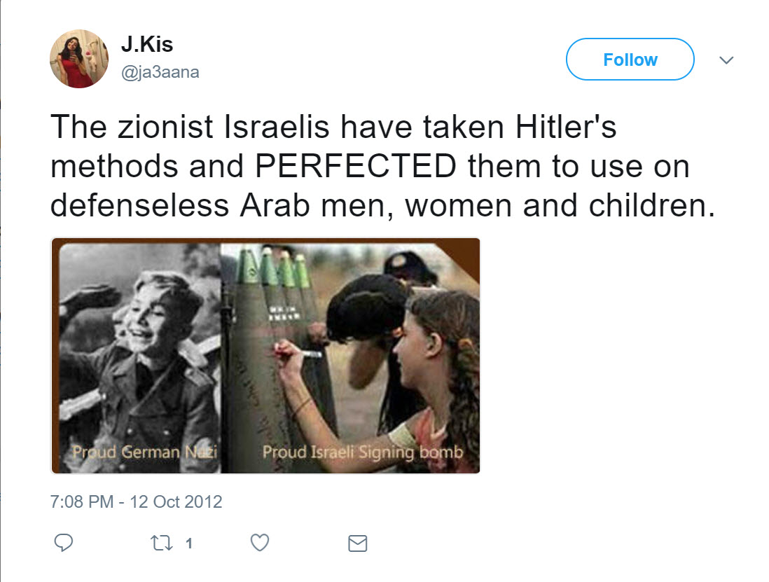 tweeted: “The zionist Israelis have taken Hitler's methods and PERFECTED them to use on defenseless Arab men, women and children.” The tweet featured a photo conveying a